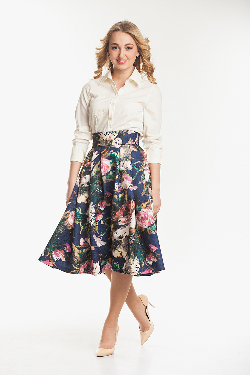 Пышная юбка из плотного жаккарда с акварельно-цветочным принтом актуальный предмет гардероба.
