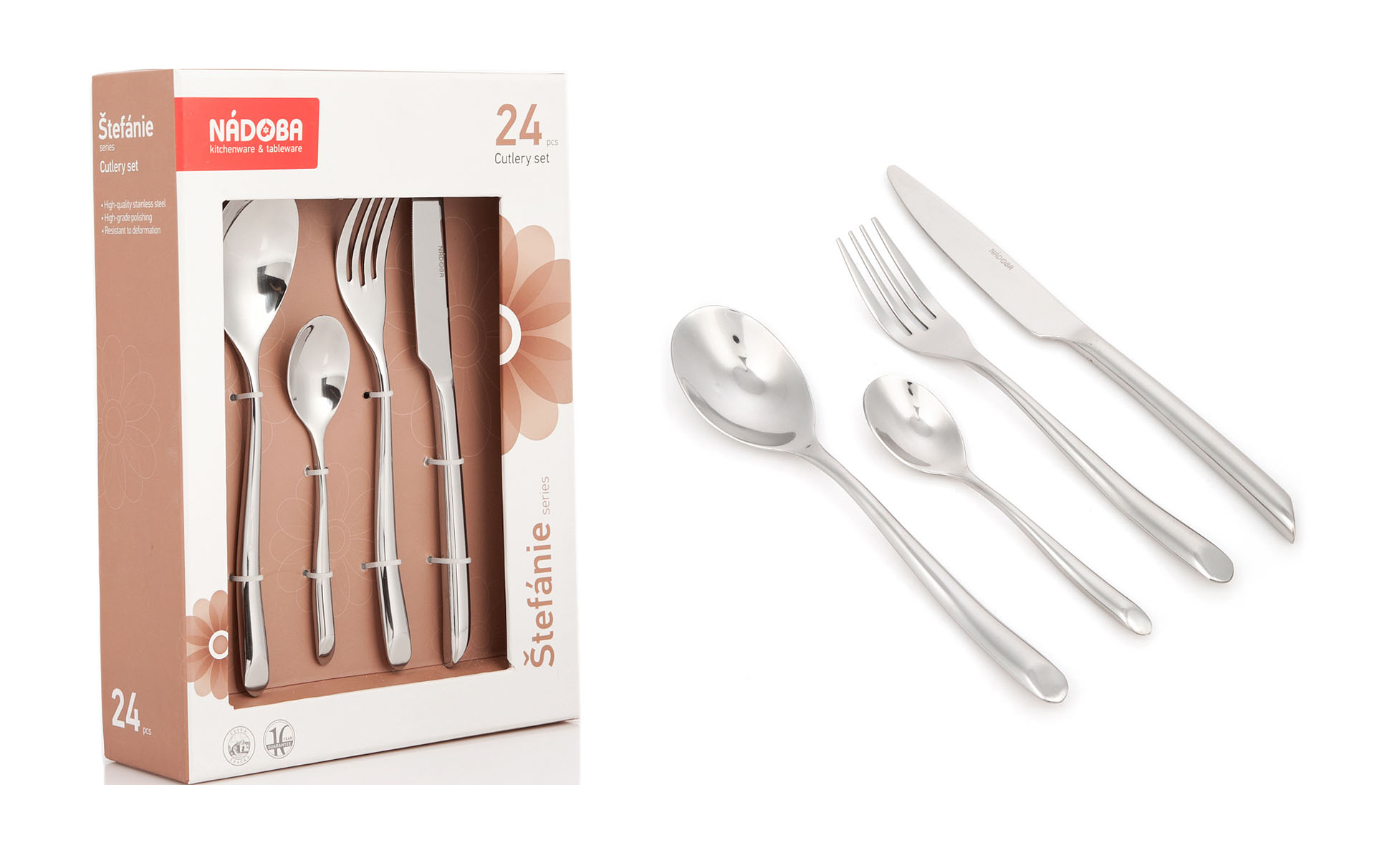 Высококачественная нержавеющая сталь. Высокая степень полировки. Устойчивы к деформациям. Набор включает: столовая ложка - 6 шт., столовая вилка - 6 шт., столовый нож - 6 шт., чайная ложка - 6 шт.