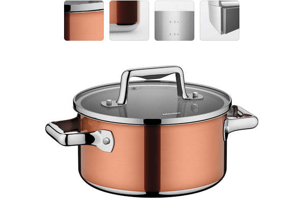 Высококачественная нержавеющая сталь 18/10. Трехслойное капсульное дно. Эффектное внешнее антипригарное жаропрочное покрытие под медь. Изящная форма. Маркировка литража. Для всех типов плит. Толщина стенок - 0,7 мм. Гарантия 10 лет.