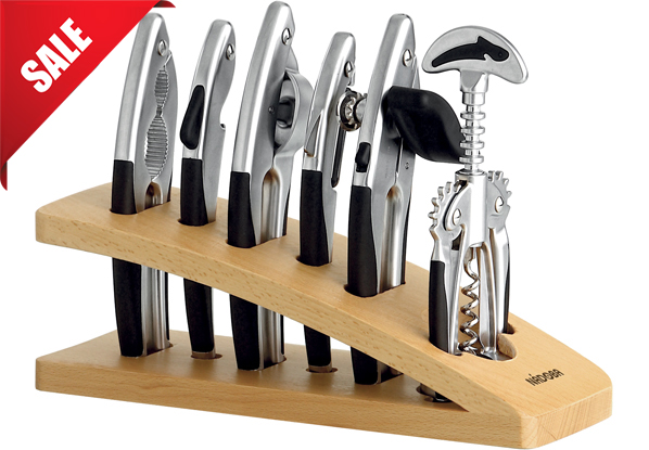Цинковый сплав с матовым хромированием. Высококачественная нержавеющая сталь. TPR-покрытие на рукоятках. Набор включает: штопор, консервный нож, овощечистка, пресс для чеснока, открывалка для бутылок, орехокол, подставка из натурального дерева (гевея). Гарантия 5 лет.