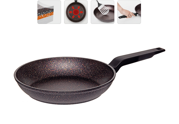 Корпус из кованного алюминия. 5-слойное антипригарное покрытие POLYGO MAXXI усиленное особо прочными минералами, внутри и снаружи. Покрытие без PFOA, полностью безопасно. Можно использовать металлические инструменты. Ненагревающаяся ручка "Софт-тач". Для всех типов плит. Гарантия 5 лет.