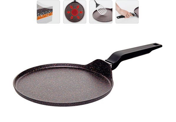 Корпус из кованного алюминия. 5-слойное антипригарное покрытие POLYGO MAXXI усиленное особо прочными минералами, внутри и снаружи. Покрытие без PFOA, полностью безопасно. Можно использовать металлические инструменты. Ненагревающаяся ручка "Софт-тач". Для всех типов плит. Гарантия 5 лет.